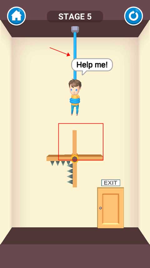 本关设有秤砣机关,因秤砣过重,必须先将其放下,才能顺利剪断绑住宝宝的绳子,完成救援。