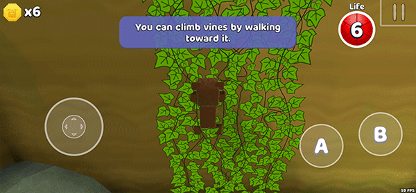 5、当靠近藤蔓或树叶时,长按左下角方向键向上即可实现攀爬。