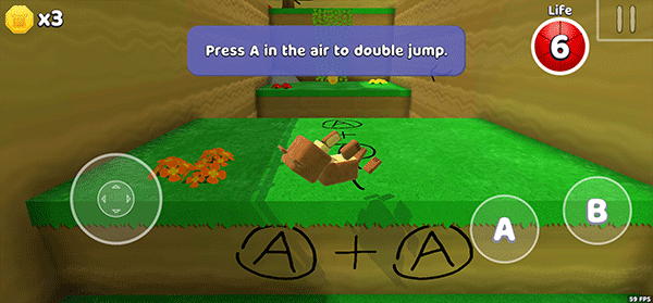 9、每个关卡都充满挑战,一旦掉落到危险区域就会损失一条生命。路上除了金币,还有恢复生命的爱心图标,靠近即可回血(满血状态无效)。