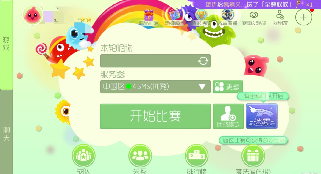 2、藏身:你不要输入名字,吃到一个队友的二分之一大,让后藏在队友身体里面,让他去吸引一个大球吃它,让后,你在里面分身,让队友变大反杀开黑效果更佳。