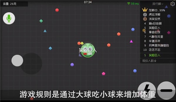 游戏规则是大球吃小球,在游戏一开始,地上洒满了小球,你吃掉小球,你的体积就会增大,当你增大到比别人的球大时,你就可以吃别人的球了,当然你也得躲避比你大的球。小球速度快,大球速度慢。