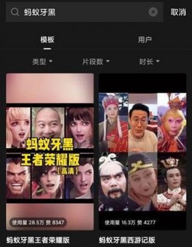 6.打开手机上的【剪映】app,搜索【蚂蚁牙黑】然后找到想要视频的视频模板,随意选择一个版本;