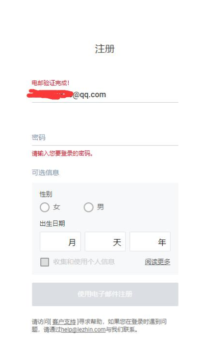之后该输入个人信息,电子邮件以及设定密码,密码要六位以上,之后打勾勾,之后点击红色按钮确认,