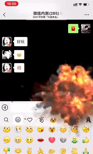 同时,更新了自带表情包,老款表情包都有变化。特殊表情会有全屏动画,比如“庆祝”会满屏放烟花。发出的自带表情包比之前的大,且过1秒会有个缩小回正常尺寸的动画。