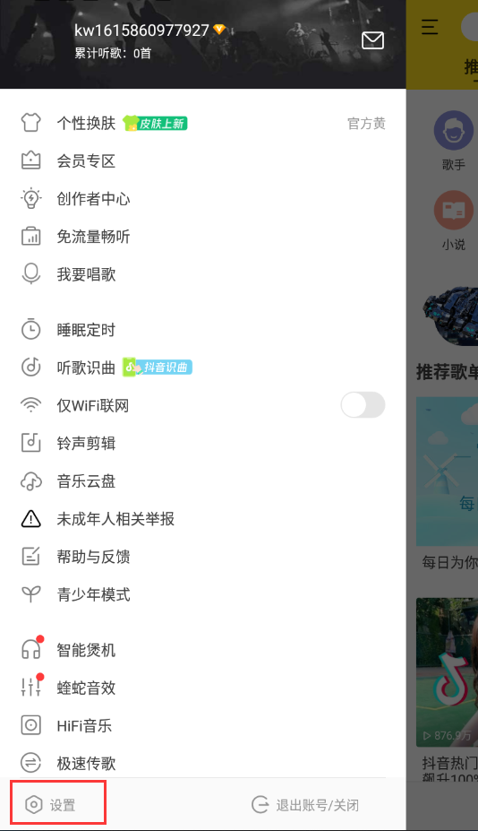 6、如果你想要注销账户,再次找到”设置“,找到”注销账户“这一项,需要告诉大家的是,在用酷我将手机和电脑列表同步时,是有时间间隔的,所以在你电脑列表变化后,手机列表可能暂时不会变化。