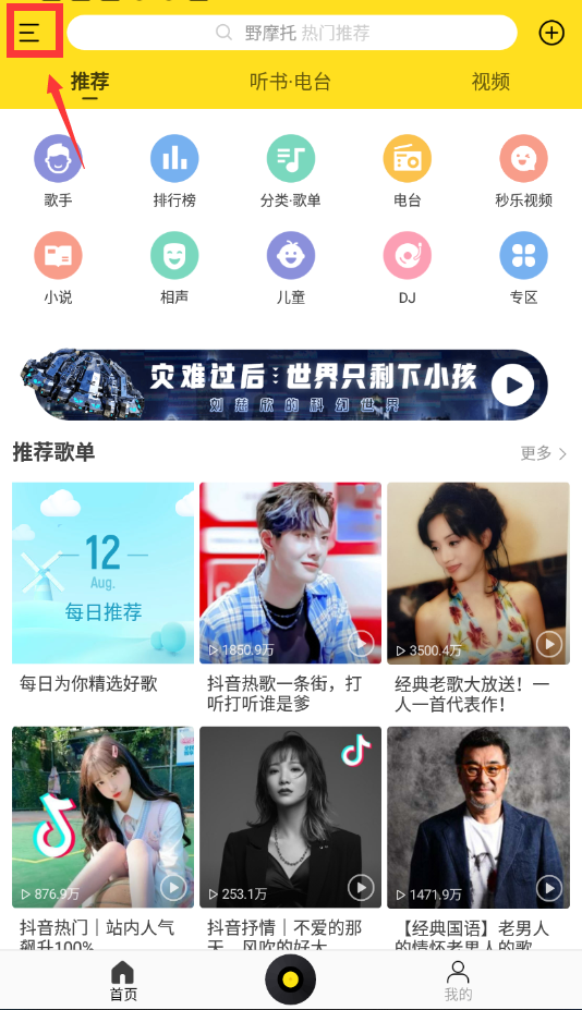 1.下载安装酷我音乐app,打开软件并且在首页点击右上角的【菜单】;