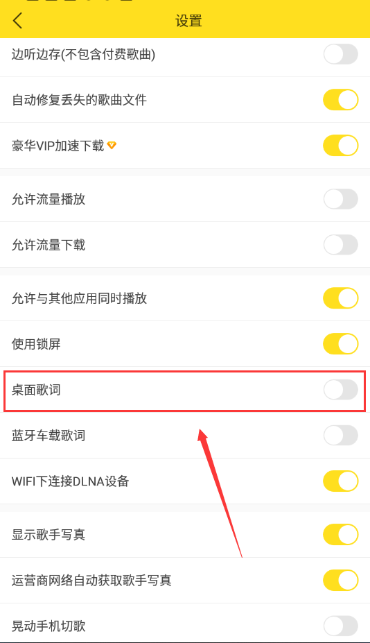 4、找到桌面歌词打开后面按钮,这样就设置成功了。