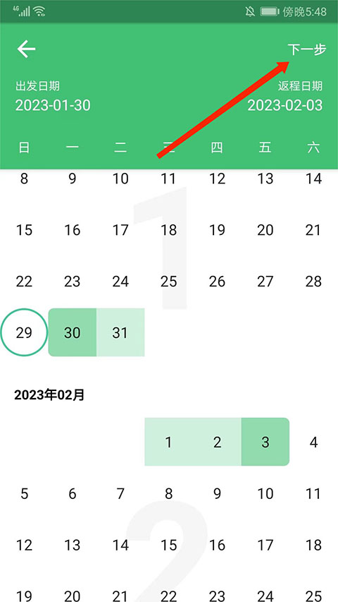 2.开始选择“出发日期”和“返程日期”,然后选择右上角“下一步”选项,