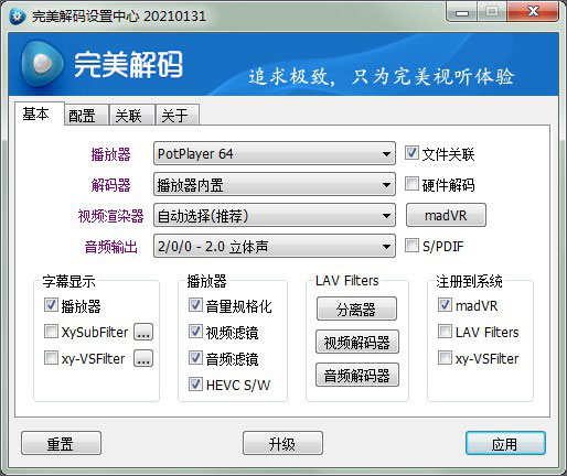 完美解码播放器2021版是为高清影视爱好者所打造的一款专业播放器,,能够解决我们日常99%的播放需求。与上一版本相比较,该版本更新了PotPlayer,并且在解码能力、兼容性、响应速度等方面性能变得更加优秀,画质远远超过了市面上主流的播放器。同时,它自带了Media Player Classic、KMPlayer、PotPlayer三款流行播放器,完美支持各种流行多媒体文件流畅播放,更可配合压制工具进行多种多媒体格式相互转换.