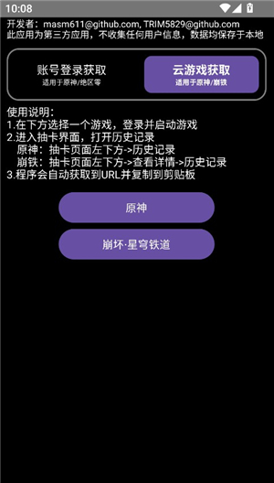 2、崩坏星穹铁道的游戏抽卡获取,目前仅支持B服的获取和官方版本的获取,原神的辅助工具,可以清楚的查看查到抽卡情况。