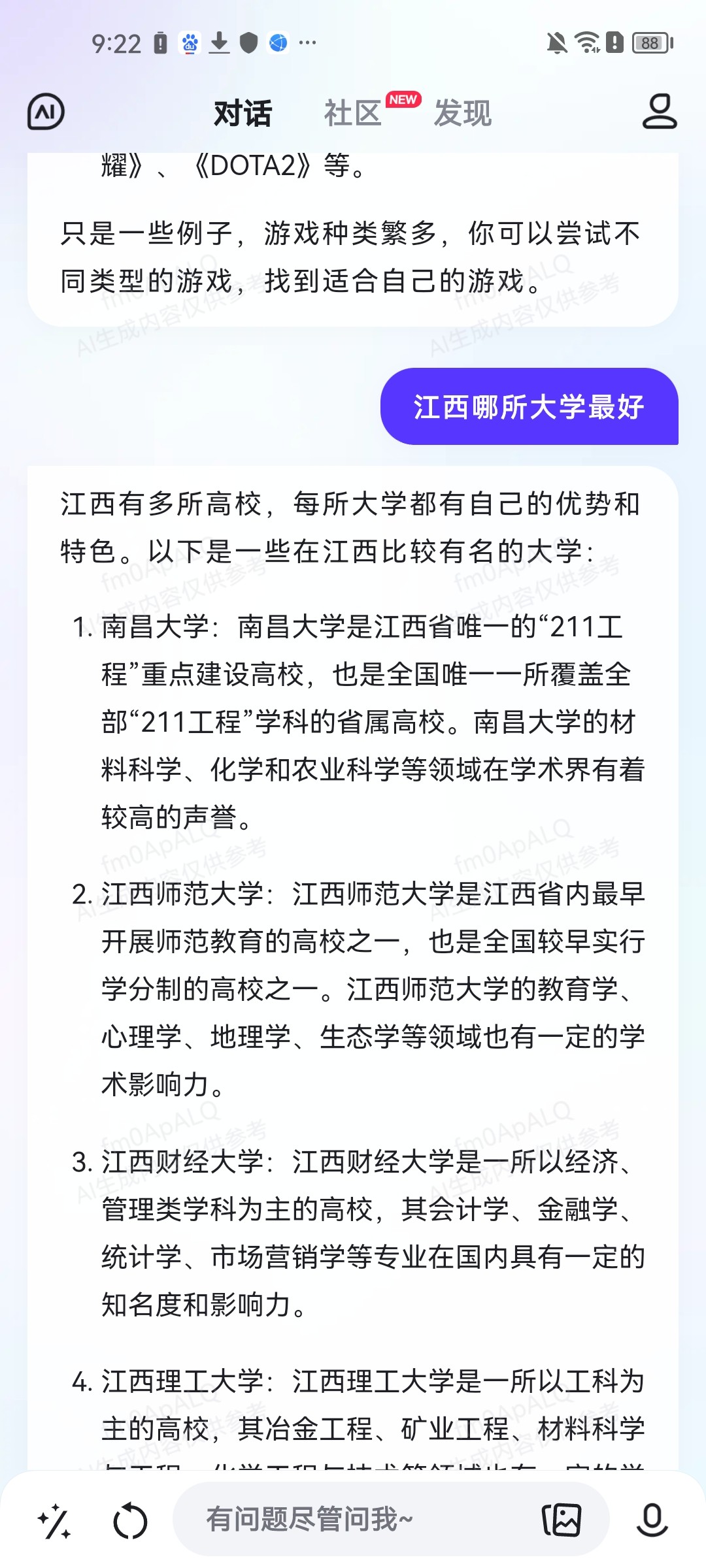 1、能够与用户进行互动对话,解答用户提出的各类问题,提供知识、信息和相关服务。