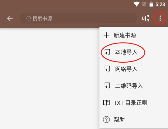 3、点击右上角的竖排三点,选择本地导入。如果是书源网址,点击下方网络导入,然后粘贴网络书源使用。