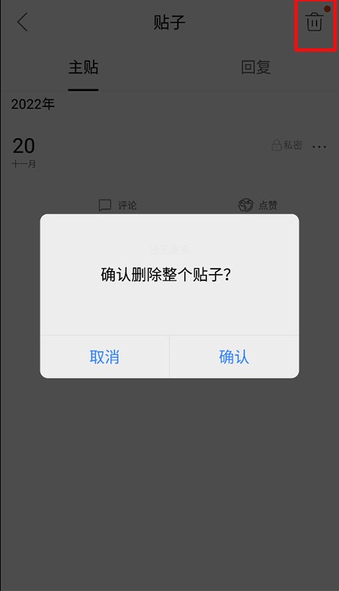 2、然后,在贴子中的主贴或回复帖中找到并点击需要删除的贴子,找到并点击右上角红色方框内的功能按钮;