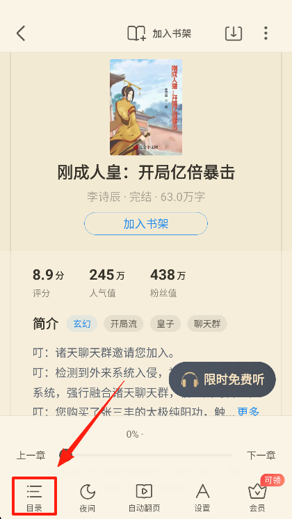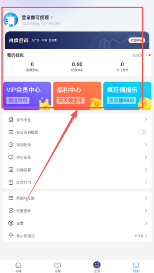 1、切换至底部导航栏中的【会员】页面,点击顶部【米读会员】入口