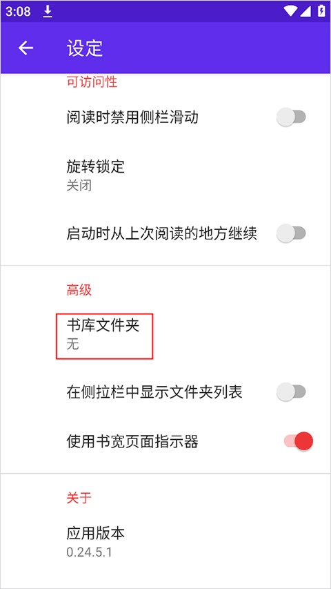 3、进入到设定页面,再点击“书库文件夹”选项;
