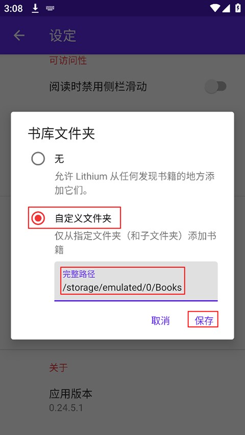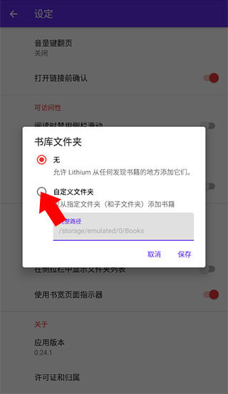 4、点击“自定义文件夹”,并手动选择你存放epub书籍的文件路径。