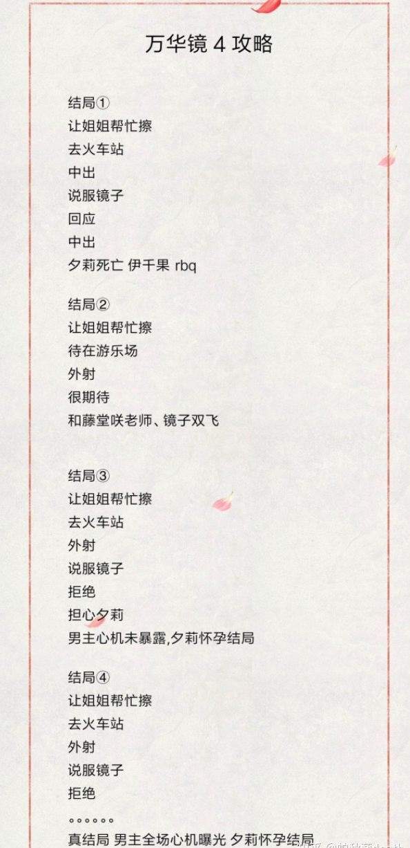 第四话,第一个结局,选择让姐姐擦,然后接着去火车站进行送别,后面的剧情就是中出并且说服镜子,第二个结局,第一个选择一样,接着就是在游乐场等她,最后就是和老师在一起了,第三个结局基本上和第一个结局的流程差不多,后面为了说服镜子却被拒接了。