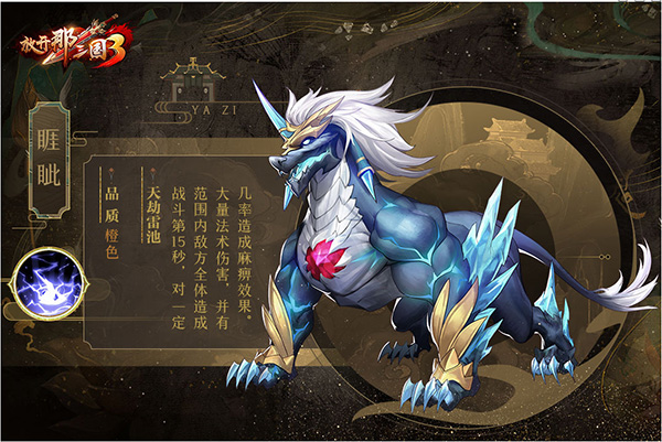 技能简评:睚眦是钟山神的上位,全体伤害还有几率触发麻痹效果,兼具输出与控制。
