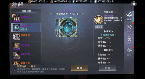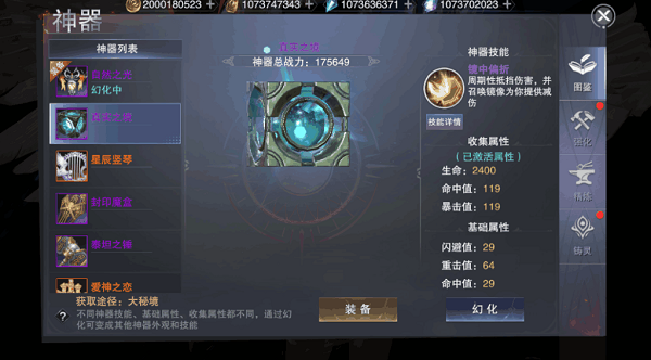 神器图鉴就是玩家拥有过的神器收集图鉴,只要曾经拥有过的神器它就能够解锁,而神器系统中会有一个“幻化”的功能,其中这个幻化功能相当于神器的皮肤,只可以改变神器的外表但不会影响神器的属性,大家如果觉得自己装备的神器很强,但是太丑或者技能不满意,就可以“幻化”成图鉴里拥有的神器模型。