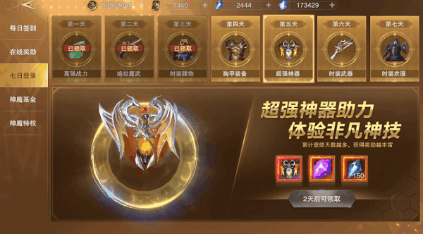 2、玩家在进入游戏登陆的第五天即可在七日登陆的活动中领取神器-自然之光,如果七日登陆的活动过了,就领取不了。