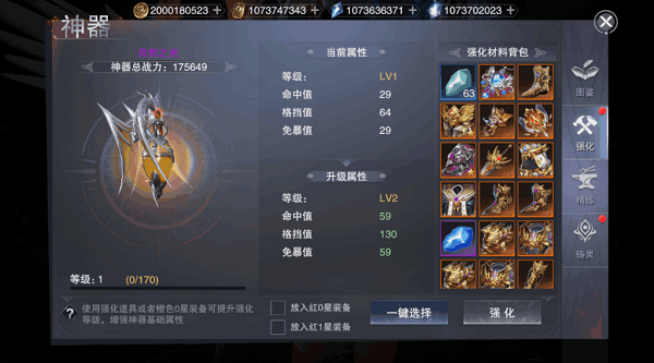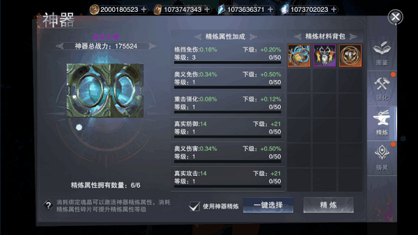 神器精炼可以使用神器进行精炼,也可以选择精炼材料来进行,其作用是解锁神器的属性加成,神器的精炼属性最高只能拥有6个,并且是可以继承的,大家可以放心的去强化它了。