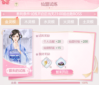 仙盟试炼可由管理人员用仙盟财富或个人灵玉开启。仙盟试炼每日23:30统一关闭,0:00后可重新开启。仙盟试炼次数每日刷新。在仙盟试炼中可获得个人贡献、仙盟财富、仙盟经验,而仙盟经验需要通关试炼后才可获得。对试炼BOSS造成最后一击的玩家可获得额外奖励。一个试炼被通关后,每个参与过该试炼的仙女都会有通关奖励,奖励次日通过邮件发放,如果仙女当天通关多个试炼,则只会获得最高等级的试炼奖励。