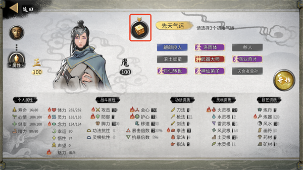 然后再来介绍一下捏脸还有神通选择,捏脸不仅可以增加魅力,捏一张好看的脸还能让自己看的舒服点,气运影响的就更多了,开局roll三个好用的气运非常重要。